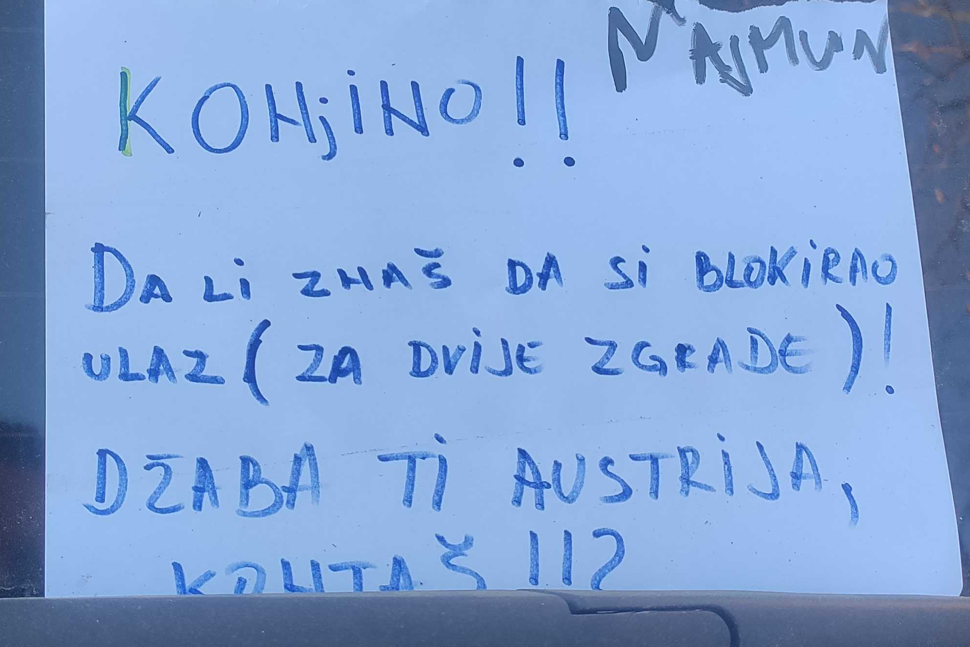 Ovaj stranac nagrađen je sa porukom: “Konjino, da li znaš da si blokirao ulaz za dvije zgrade. Džaba ti Austrija, kontaš?!”.