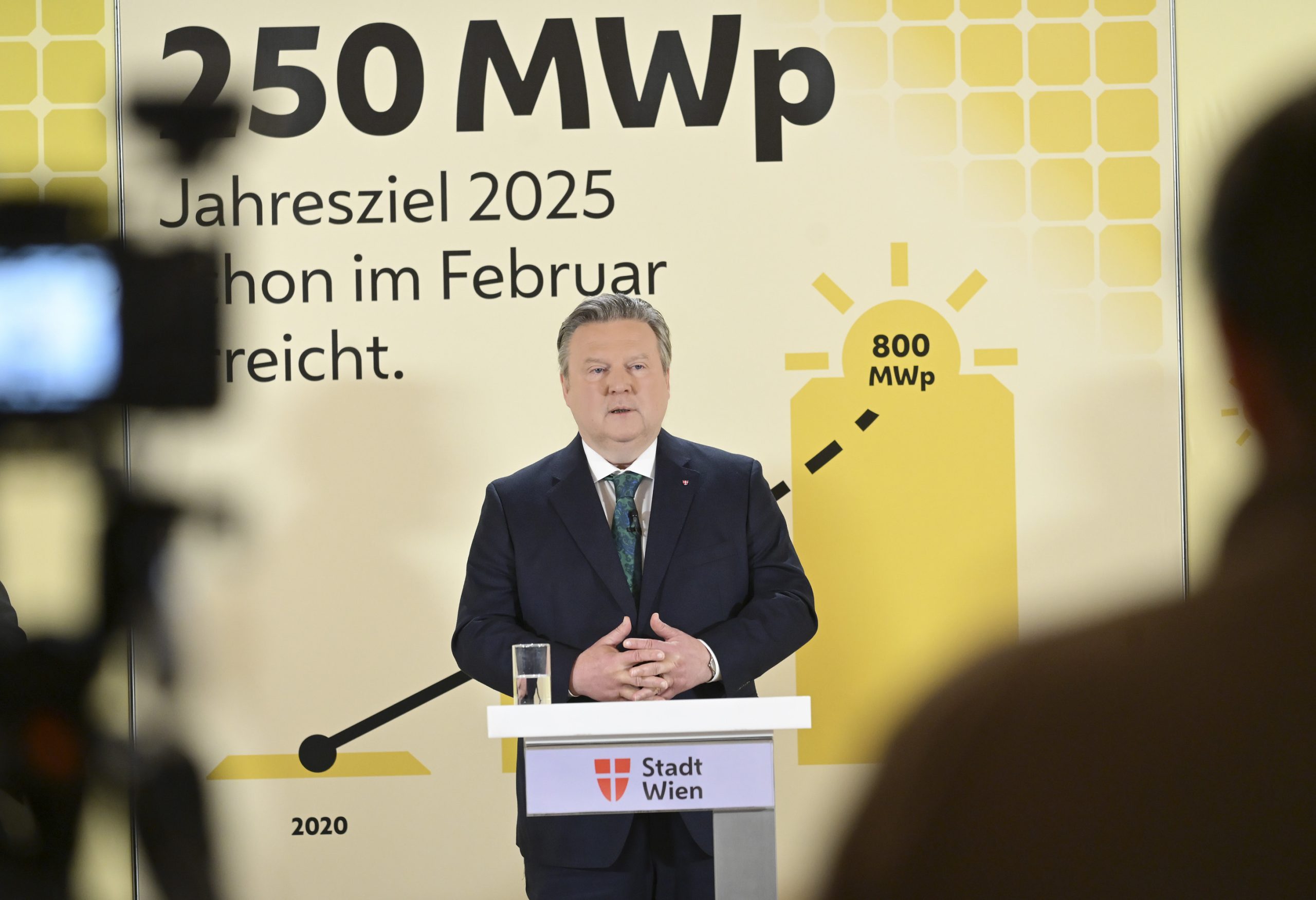 Nach einer Treibhausgas-Reduktion von 12 % und einem Rückgang des Energieverbrauchs um 33 % hat die Stadt das Jahresziel von 250 MWp Sonnenstrom bereits zehn Monate früher erreicht. 50 MWp davon stammen von stadteigenen Flächen. Bürgermeister Michael Ludwig, Klimastadtrat Jürgen Czernohorszky und NEOS-Energiesprecher Stefan Gara präsentierten die Ergebnisse im Rathaus.