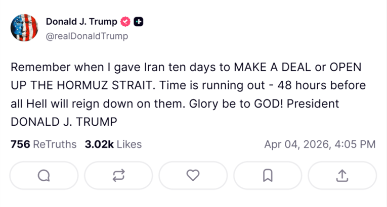 “Sjećate se kad sam Iranu dao deset dana da postigne dogovor ili otvori Ormuski moreuz? Vrijeme ističe – još 48 sati prije nego što im stigne pakao. Slava Bogu”, napisao je Tramp.
